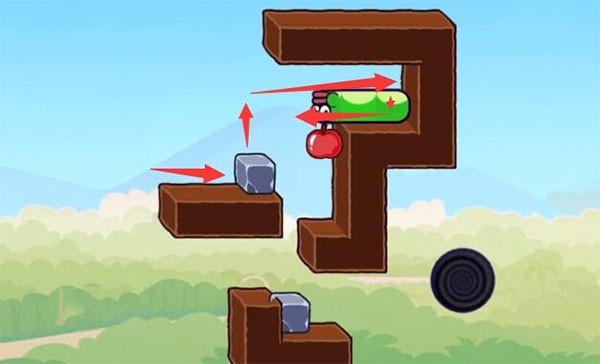 1、移动贪吃蛇,先利用左边的石头和苹果,把右边的石头推下去,然后吃掉那颗苹果。