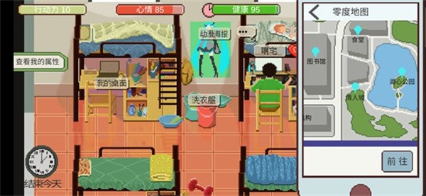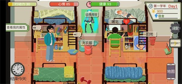 4、退出桌面,就可以看到自己的宿舍,玩家可以和是由聊天打游戏,获得好感度,也可以洗衣服、拖地,来增加自己的健康值。