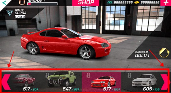 点击左右切换,挑选心仪赛车并查看详细参数。