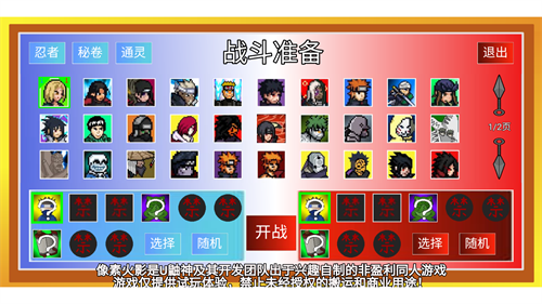 3、在游戏正式开启前,玩家可依据自身需求挑选对应的忍者、秘卷与通灵;倘若进行的是人机关卡对战,对手的设定同样需要玩家自行选择。