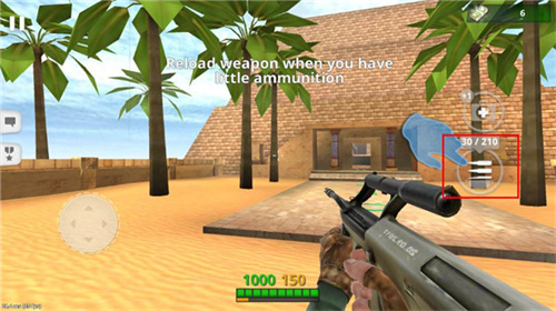 1、游戏采用第一人称视角的表现形式,利用虚拟摇杆控制操作,点击弹药键进行换弹;