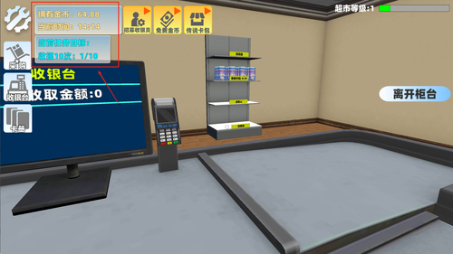 2、调整货架布局时,操作方式为点击并拖动;右侧的按钮是用来进行结账收银的;界面顶部会显示当前的资金和库存情况,这样能方便用户随时查看并调整。