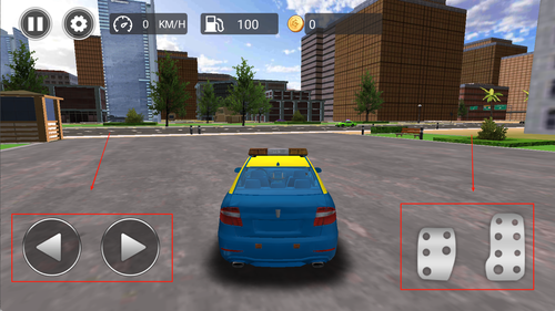 2、左侧的方向盘用于控制行驶方向,右侧设有加速、刹车及特殊功能按钮,底部则是任务提示信息栏。