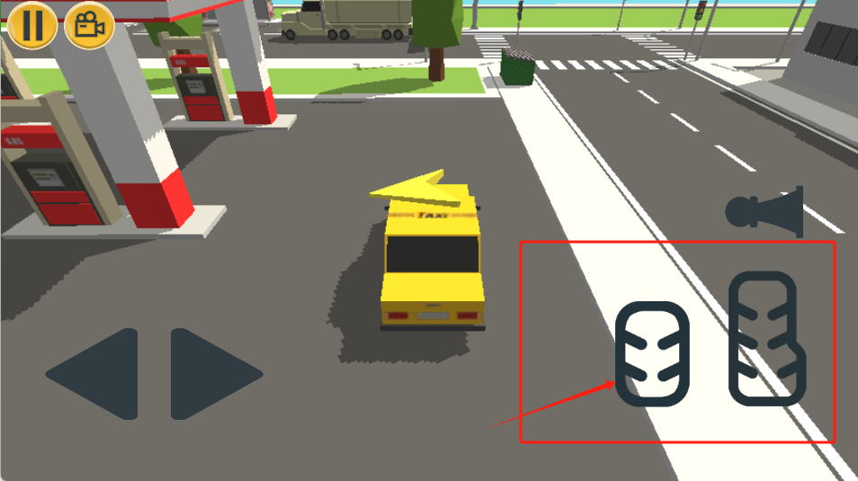 2、驾驶黄色出租车前往加油站加油,通过右侧的轮胎按键来操控方向。