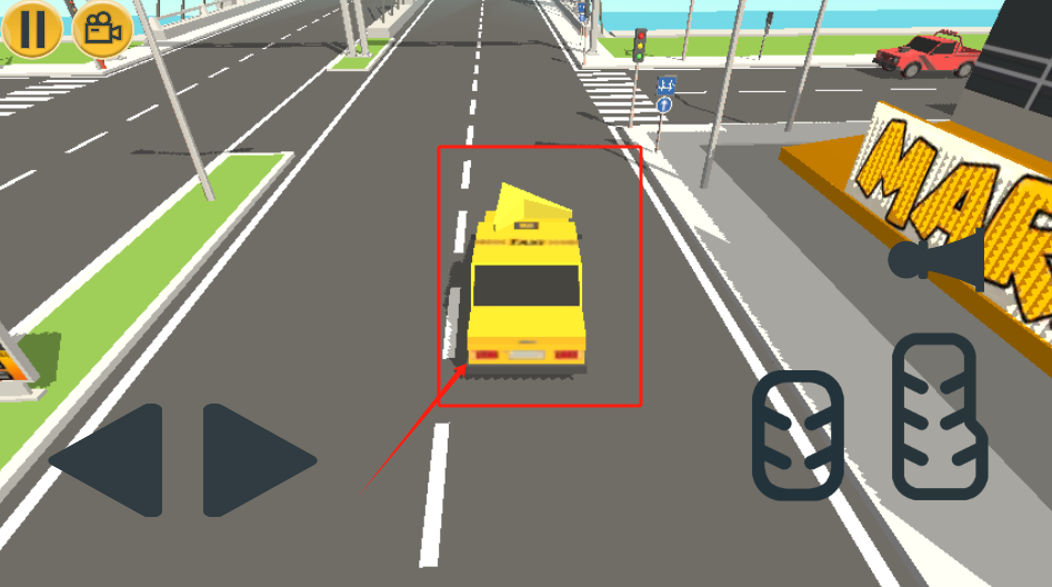 3、操控红框内的黄色车辆向前行驶,避开障碍物后开到MARK招牌位置。