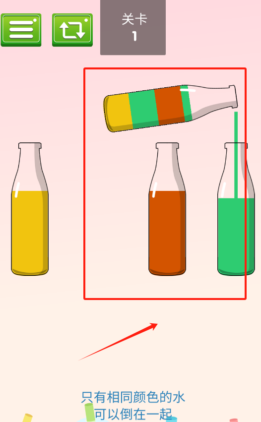 3、将左侧的黄色液体倒入右侧的绿色瓶子中,要注意只有相同颜色的液体才可以混合。
