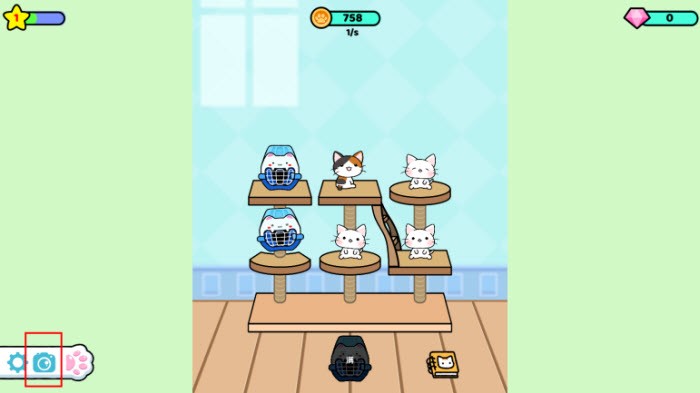 5、游戏左侧的“猫爪”图标里藏着互动功能,点击相机按钮就能给你喜欢的猫咪拍照记录。你也可以把照片保存下来或者分享给好友,一同展示你最爱的猫咪组合!