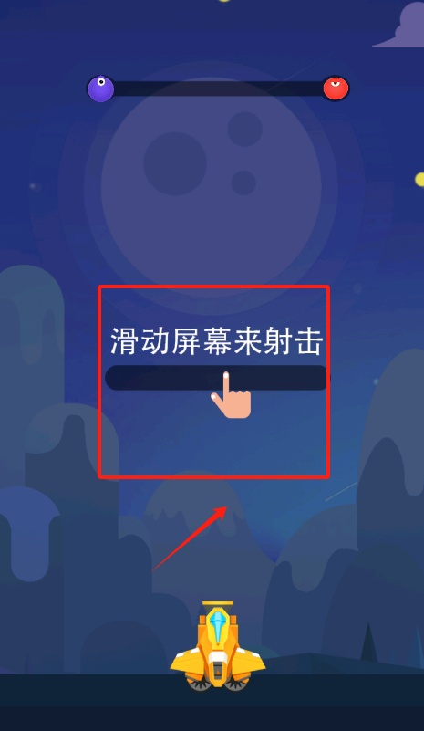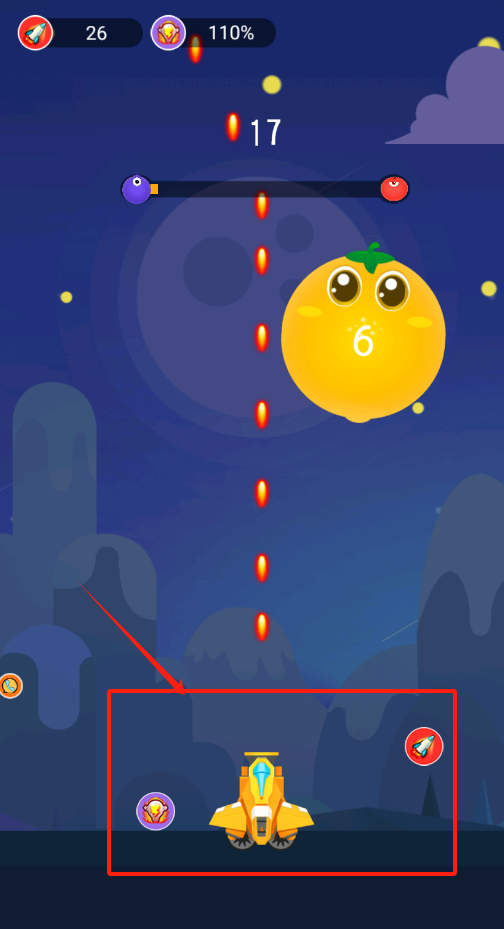 2、看到红框里的手势指引了吗?用手指在屏幕上左右滑动,就能操控黄色小车发射子弹击打水果啦。
