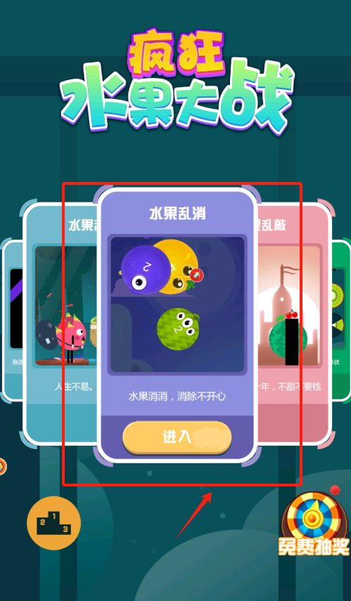 1、看到中间紫框里的水果摆放杂乱,用手指点击这个紫框,再点击下方的蓝色进入按钮,就能开始玩游戏啦。