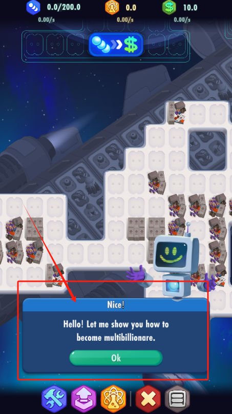 1、点OK按钮开始新手引导,跟着提示学习怎么赚钱。