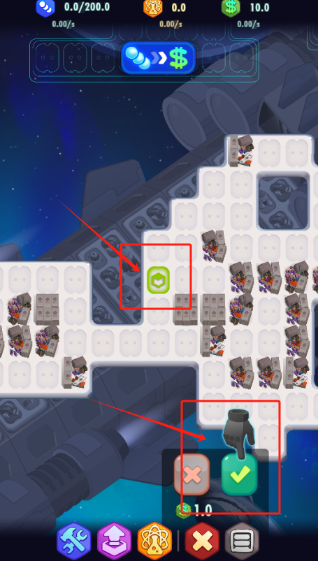2、按红框提示点绿色装置和手图标,完成建造任务。