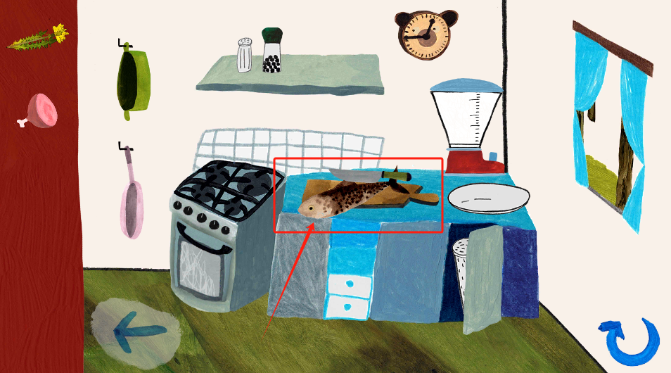 3、用炉灶和搅拌机做菜,案板上有鱼,右下角刷新换食材。