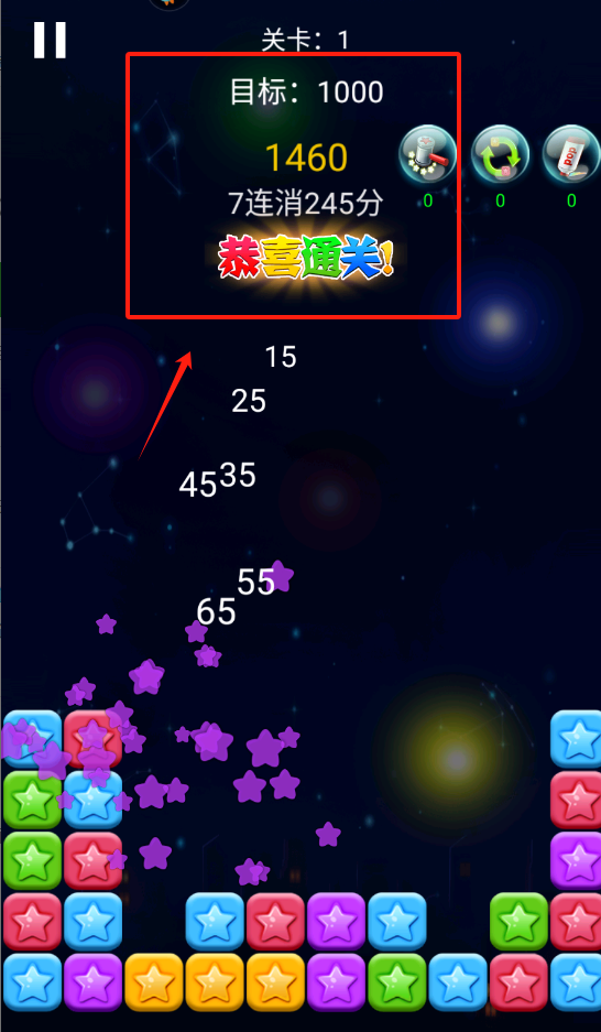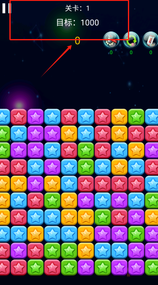 2、瞅见屏幕上方显示关卡1 目标1000分,点下方彩色星星方块交换位置消除得分哟。