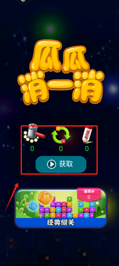 1、看到深蓝色星空背景和瓜瓜消一消标题,点绿色获取按钮就能进入游戏页面啦。