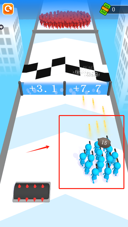 2、避开上方的红色小人,在黑白格子的赛道上行走,吃到+3.1的加成区域。