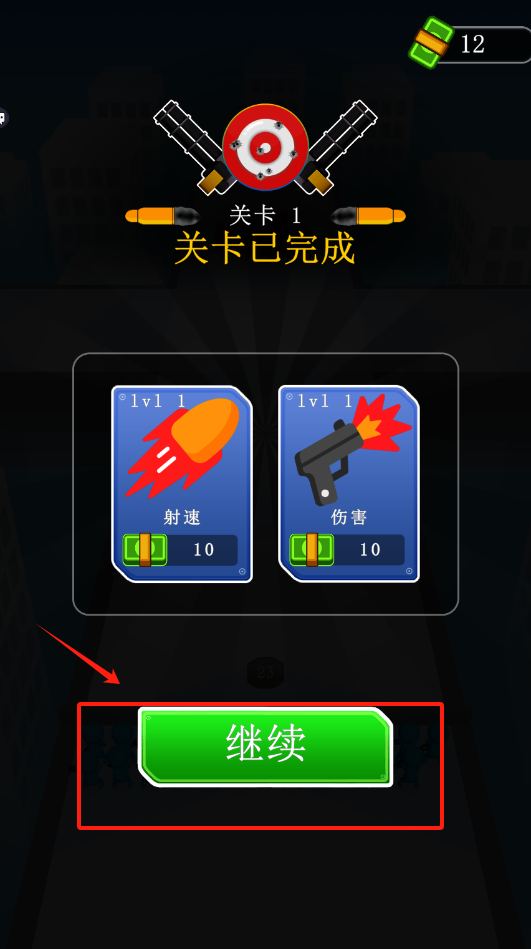 3、点击绿色的继续按钮,使用射速为10的武器进入下一关,继续战斗。