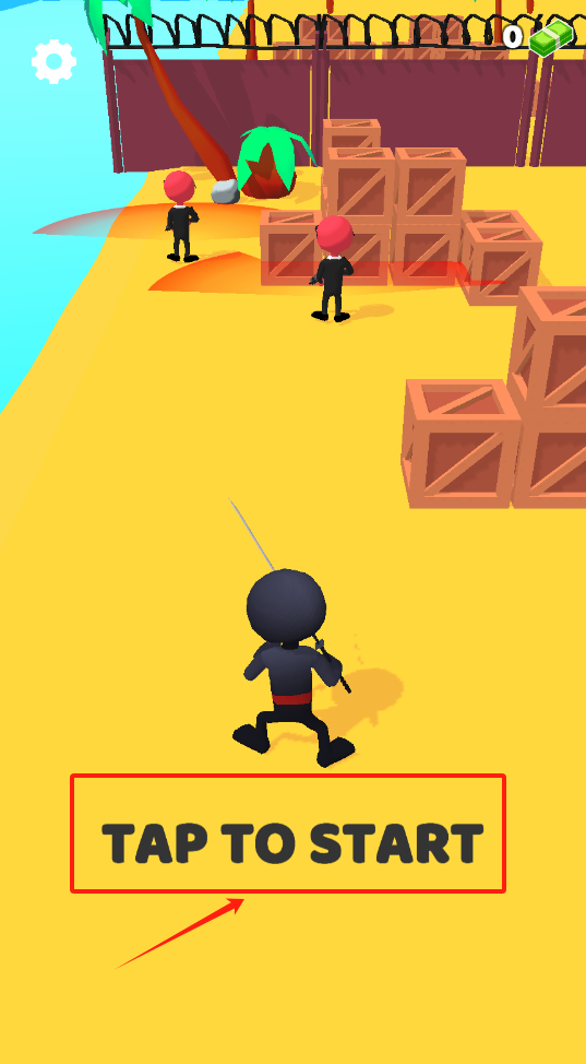 1、点击红框里的开始按钮,操控黑衣忍者冲向敌人,别被箱子挡了路。