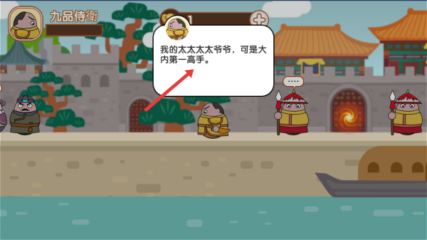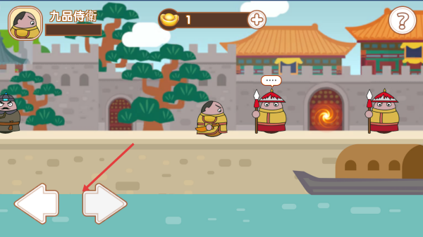 1操控“九品侍卫”这一角色时,可通过点击左右箭头样式的方向键,使其在皇宫、河岸等不同场景中进行位置移动。