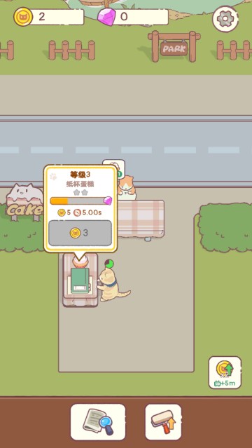 3、创建完成后,我们的猫猫员工会自动制作纸杯蛋糕送给顾客,以此获取金币,之后玩家需要持续消耗金币来升级自己的工作台。