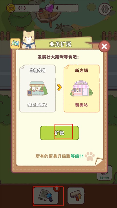 6、当玩家成功将纸杯蛋糕工作台升级到满级后,可点击业务扩张按钮,将纸杯蛋糕店铺升级为全新的甜品站店铺。