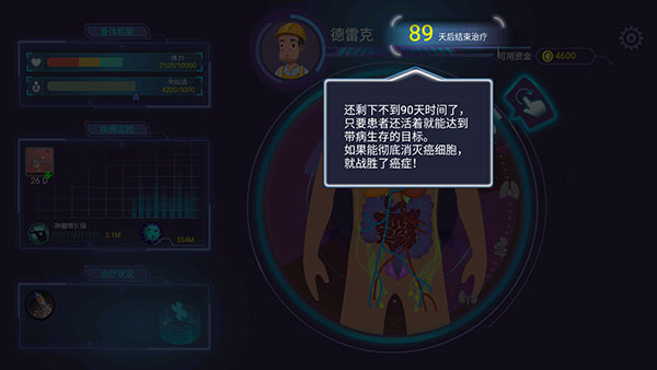 6、当上方的时间显示患者还剩下不到90天时间,如果能彻底消灭癌细胞,就战胜了癌症;