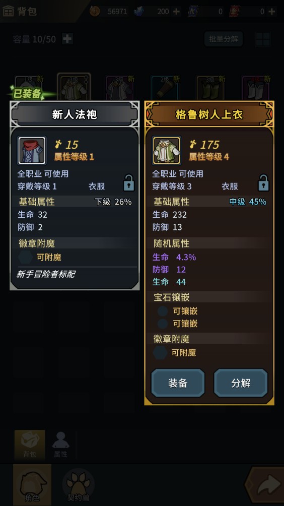 6、点击屏幕左下角的背包图标,进入背包界面后即可为角色更换或装备新获得的武器与防具。