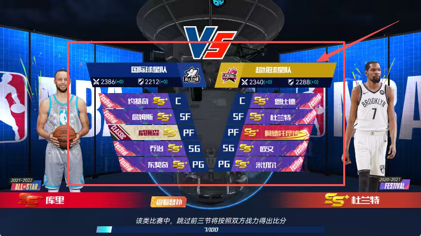 2、查看两队战力值及首发阵容,了解跳过前三节按战力比分的比赛规则说明。