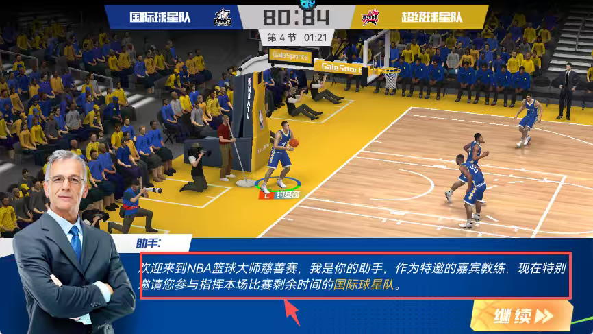 3、接受助手邀请担任特邀嘉宾教练,点击继续按钮指挥国际球星队完成比赛。