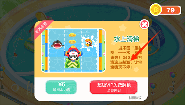 1、进入乐园后,点击水上区域,查看处于锁定状态的设施,可选择通过付费或VIP方式解锁后游玩。