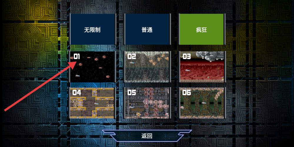2游戏的关卡选择页面设有三个难度层级,分别对应不同的挑战强度,下方排列着六张标有序号的关卡预览图,每张图都呈现出独特的场景风貌。其中,第一张关卡图旁有醒目的指示标识,提示玩家当前可进入该关卡。整体设计充满未来感,正等待着玩家开启一场精彩的星际射击冒险。
