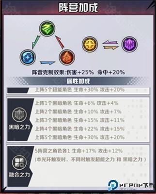 1. 游戏中的阵营分为五个类型:神速(绿)、掌控(蓝)、崩坏(红)、超能(光)和暗。