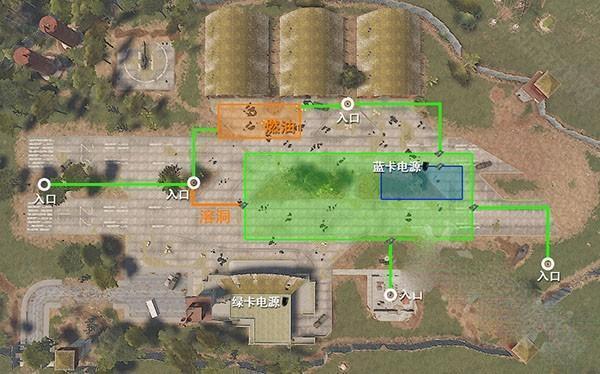 2、机场的隐藏补给藏在地下,得放两根保险丝才能开启。地下的结构比较复杂,我画了张图方便大家理解。这里总共有5个入口能进到地下,蓝色和绿色的区域都是隐藏补给区,绿色区域得用绿卡才能进,蓝色区域需要蓝卡,橙色区域刷新的红色油桶比较多,不用卡片就能进。