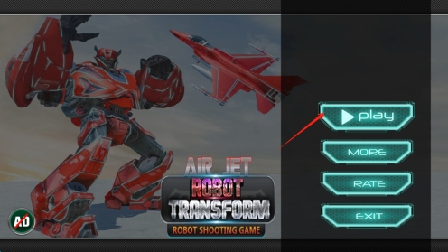 1、在Air-Jet-Robot-Transform游戏的启动界面,点击play按钮,即可开启机器人射击冒险之旅,随后点击开始。