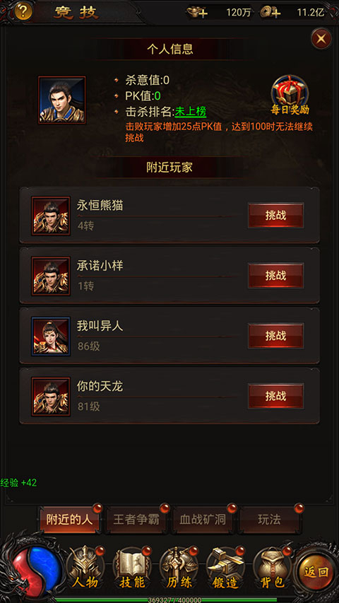 挑战附近玩家,获胜后能得到经验金币、精炼石、装备、杀意值等丰厚奖励,还会增加25点PK值。挑战失利则没有奖励,也不会增加PK值。PK值满100就不能再挑战了,PK值每分钟会减少1点。每消耗4元宝可以清除1点PK值,要是玩家PK值达到100,能花元宝消除PK值后马上挑战。附近玩家少于4人时,每分钟会补充1人。胜利次数越多,单次获取的杀意值就越多,依据杀意值能领取每日排名奖励,每天0点通过邮件发送。