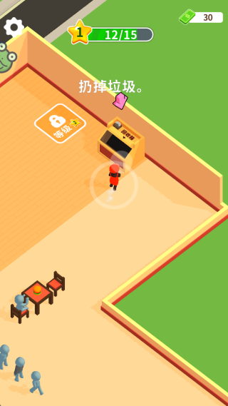3、丢弃垃圾获取收益,持续解锁更多区域,摆放更多桌子。
