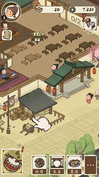 除了打尖这种经营模式外,客房服务需要玩家达到特定等级才能解锁,解锁后通过升级就能提升经营方式。另外要说明的是,客栈的菜谱种类丰富,但需要通过剧情推进和任务完成这种碎片化的方式来收集。建议玩家尽可能解锁更多菜谱,以此吸引更多顾客,同时也别忘了积极参与游戏中的随机事件互动,这会为你带来丰厚的奖励资源。