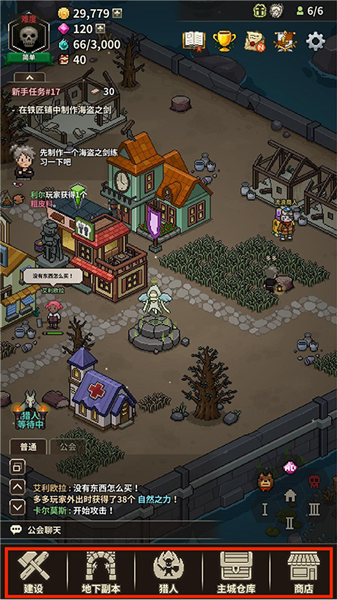 1、启动猎魔村物语游戏,进入游戏主界面后,可看到下方设有【建设】、【地下副本】、【猎人】、【主城仓库】与【商店】等选单。