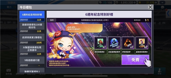 2、随着6周年庆典的开启,游戏内将推出虚宝大放送等福利活动,以此回馈玩家长久以来的支持。首先是稀有培育道具相关活动,从即日起至11月13日,玩家只要登录游戏就能领取「6周年纪念免费礼包」,礼包包含「球队选择白金球员礼包」「签名球员礼包」「技能选择变更券」等10种顶级道具,玩家可从中自由挑选4种心仪道具获取。