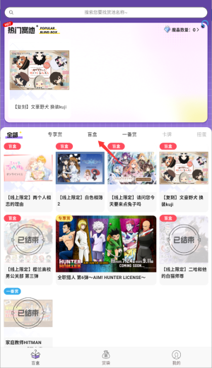 2、进入主界面后,点击底部菜单栏里的盲盒功能入口。