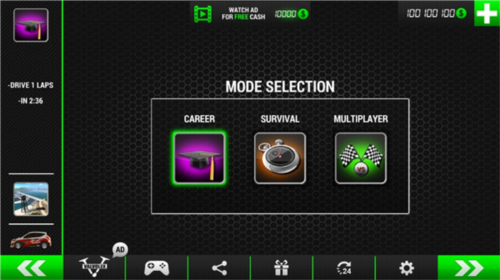 2、提供 5 种不同类型的赛车,还有生存、挑战两大模式供你挑选。