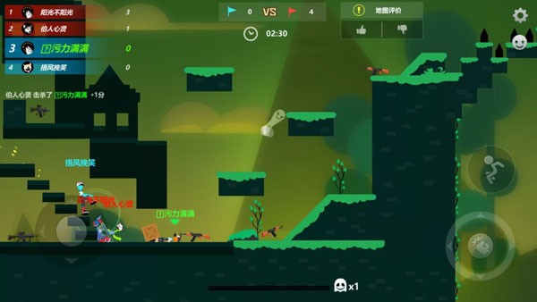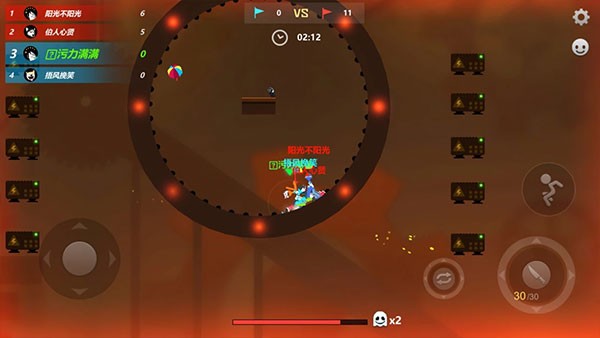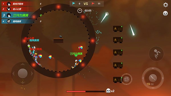 1、基础操作。玩家要操控火柴人完成移动、跳跃与攻击动作。跳跃键能让火柴人做出跳跃动作,攻击键是用来攻击敌人的。屏幕右上角一般会有一个方向键,专门用来控制火柴人的移动方向。