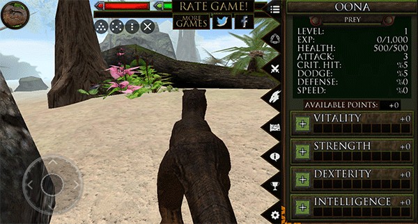 2、点击左上角的恐龙图标可展开更多界面,具体效果如下图示。在该界面中,玩家能查看自身等级与经验值;右下方区域显示生命值、力量、敏捷等属性,此外,玩家也可通过点击地图标识来查看当前所在位置。