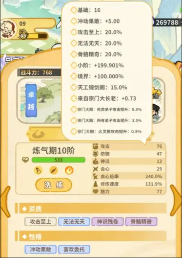 3.2 性格:对各项基础数值和生产速度起着主要影响作用,其中第二性格明确仅作用于生产速度。通常来说,战斗弟子的第一性格建议洗练主要属性;而生产弟子一般不耗费孟婆汤进行洗练,更倾向于选用拥有“生产之神”(全生产速度提升40%)特质的弟子。