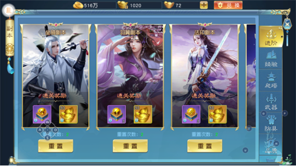 1、进阶:进阶副本设有每日挑战次数上限,次数支持重置操作,成功通关后可获得各类奖励,这些奖励主要用于角色形象的进阶培养。