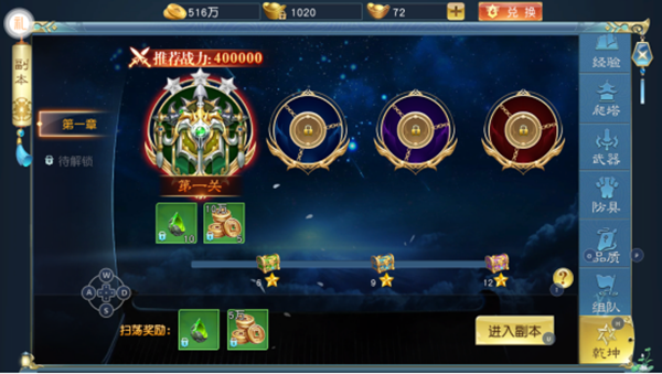 4、乾坤:通关乾坤秘境可获得大量乾坤石,每个关卡可以无限次进入,但普通奖励仅能领取一次。通关后根据星数能够获取丰厚奖励,每日最高关卡奖励会在次日0点发放。