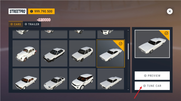 2、完成购买后,点击“TUNE CAR”选项,即可进入汽车定制界面进行个性化设置。