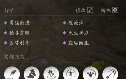 2、并且志趣的加点也是有讲究的,一般而言技能加点选择应运而生、天生神力、因势利导、独具慧眼、勇猛寂静以及观沧海。