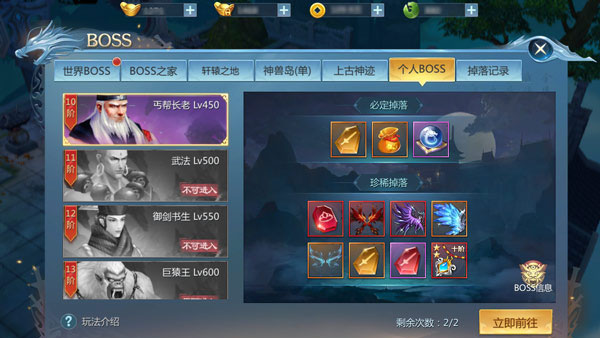 《九灵神域》的核心玩法之一是BOSS系统,玩家通过持续击杀BOSS获取游戏资源,以此增强自身战斗力。该系统涵盖了【世界BOSS、BOSS之家、轩辕之地、上古神迹、个人BOSS、神兽岛、英雄剑谷、五狱绝地】这八大玩法模块。