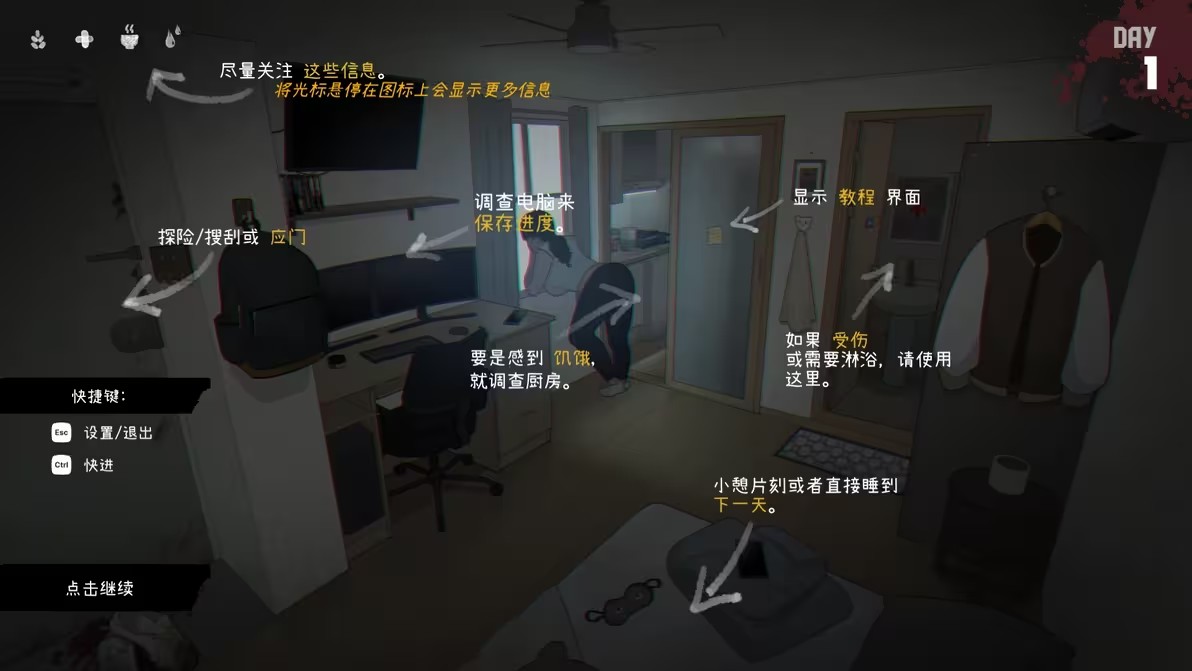 白天可以点门出门探索【楼内】&【楼外】,【对话妹子】,厨房【吃东西】,浴室【洗澡&包扎】,电脑【存档&读档】,床上【休息】。