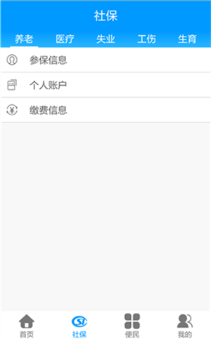 2、在社保查询界面,可以查询养老、医疗、失业、工伤、生育五个险种的参保信息、个人账户、缴费信息等信息